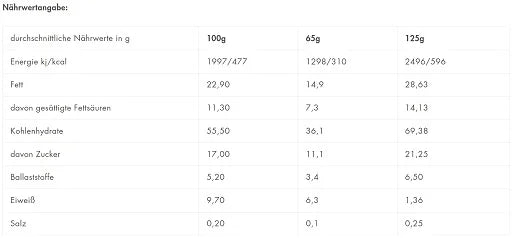 Haferflocken (47%), Invertzuckersirup, Margarine (pflanzliches Fett [Palm], Trinkwasser, pflanzliches Öl [Sonnenblume], Emulgatoren [Mono- und Diglyceride von Speisefettsäuren, Lecithine], Speisesalz [0,1%], Aroma, Säuerungsmittel: Citronensäure, Farbstoff: Carotin), Kakaoüberzug (6%) (Zucker, vollständig gehärtetes Palmfett, Kakaopulver mit reduziertem Fettgehalt, Sojamehl, Sonnenblumenöl, Emulgatoren [Sojalecithin, E476], Aromen), Kakaopulver mit reduziertem Fettgehalt, Feuchthaltemittel: Glycerin, Salz, Aromen